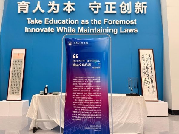 为持续加强校园廉洁文化建设,我校于2025年11月启动“清风拂中科 廉韵润我心”廉洁文化作品征集活动,共收到师生各类作品200余件。经评审,遴选出69件优秀作品自12月1日起在各学部巡回展出。